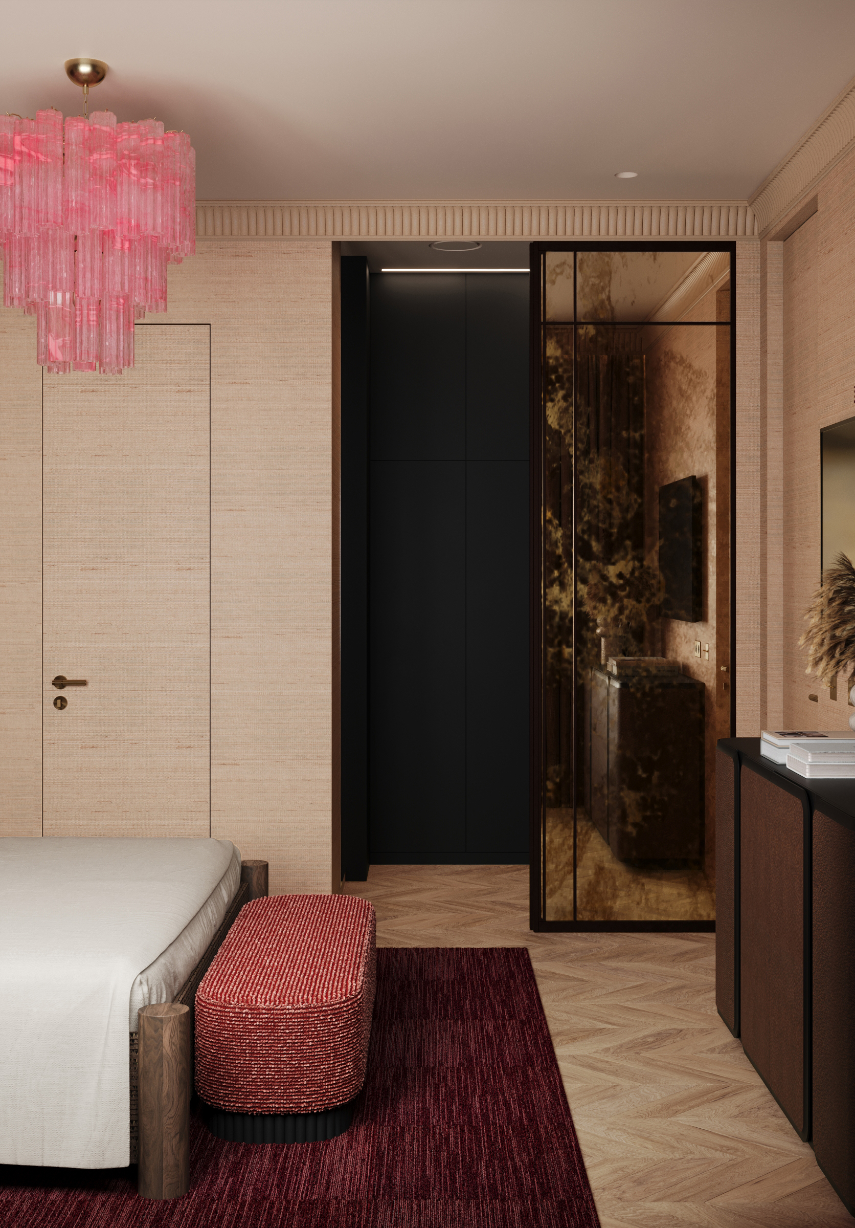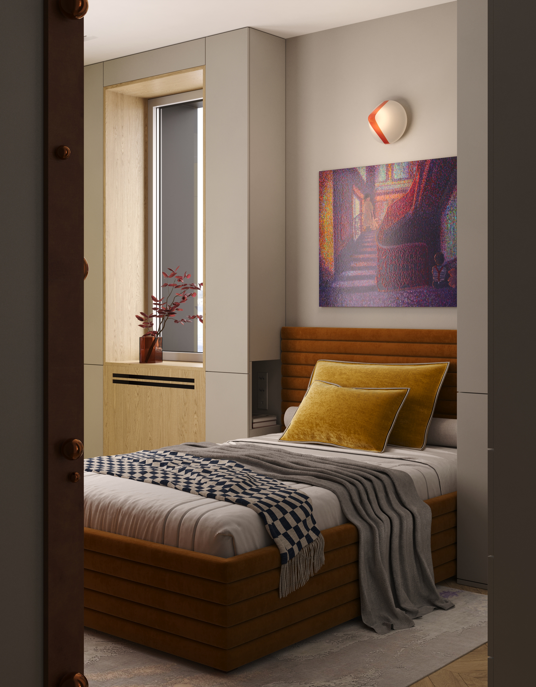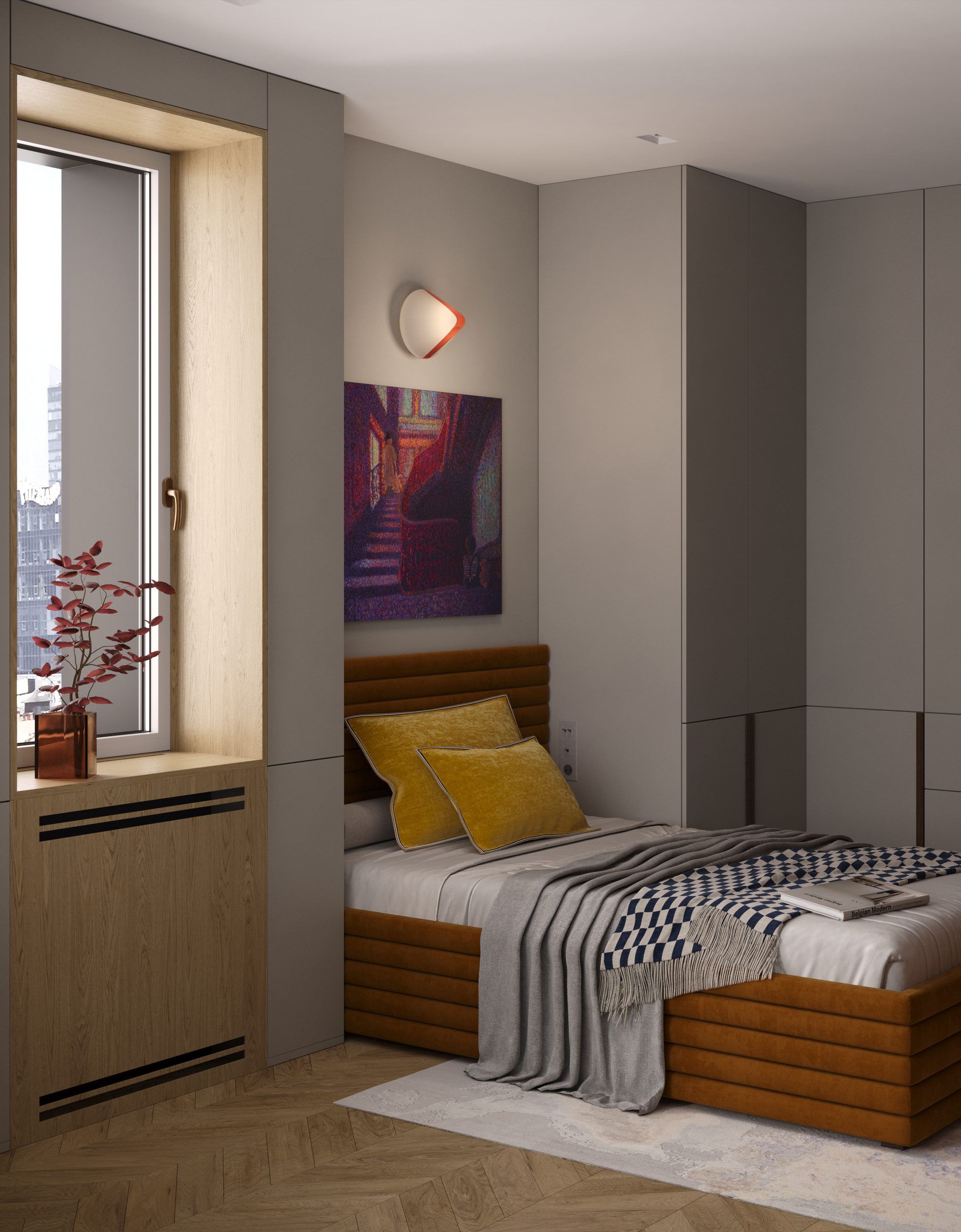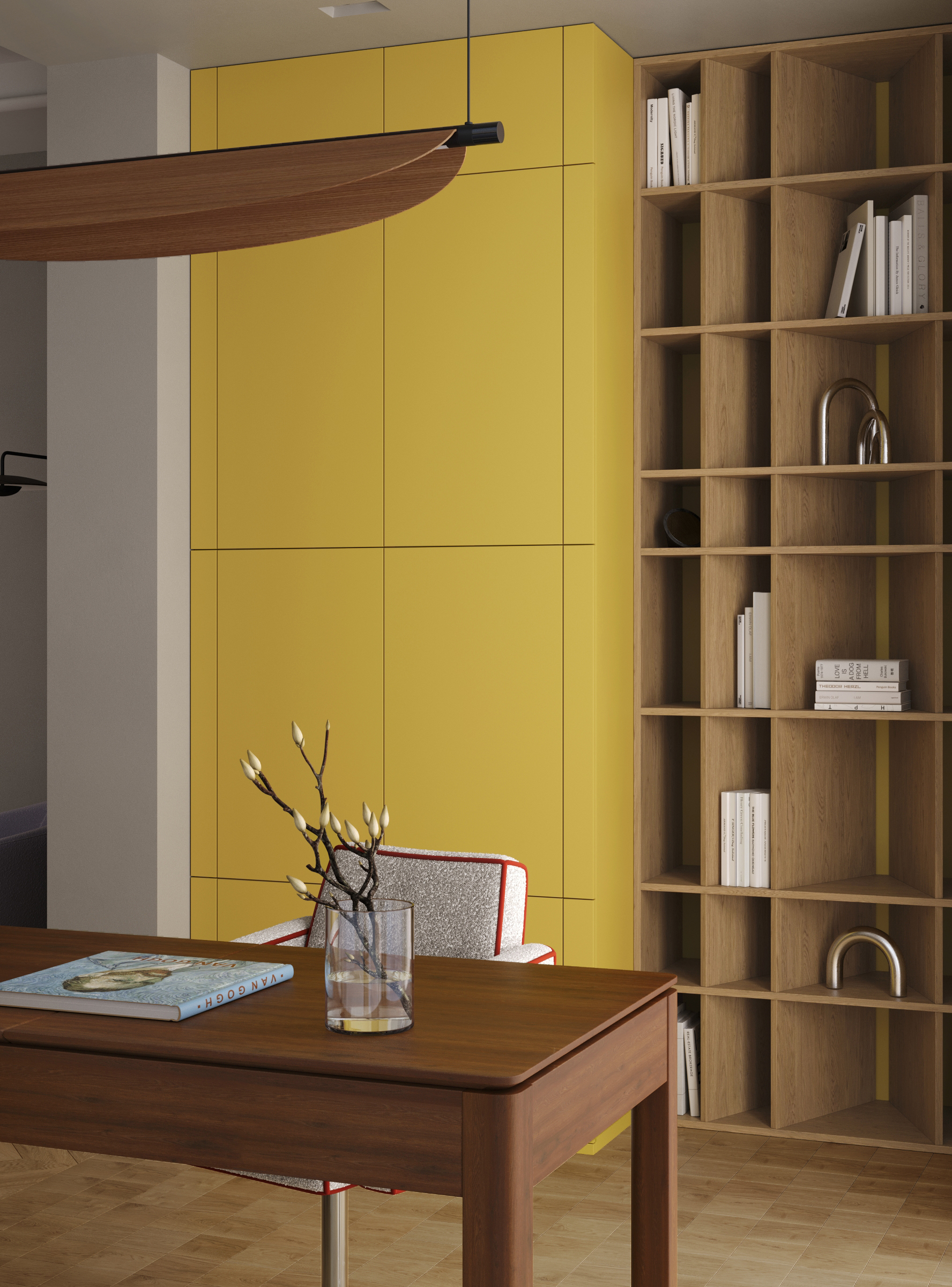 Мы сознательно пошли на взлом стереотипа о плавности перетекания палитры в квартире, чтобы сделать ее многообразной и персонализированной, как лесной пейзаж.